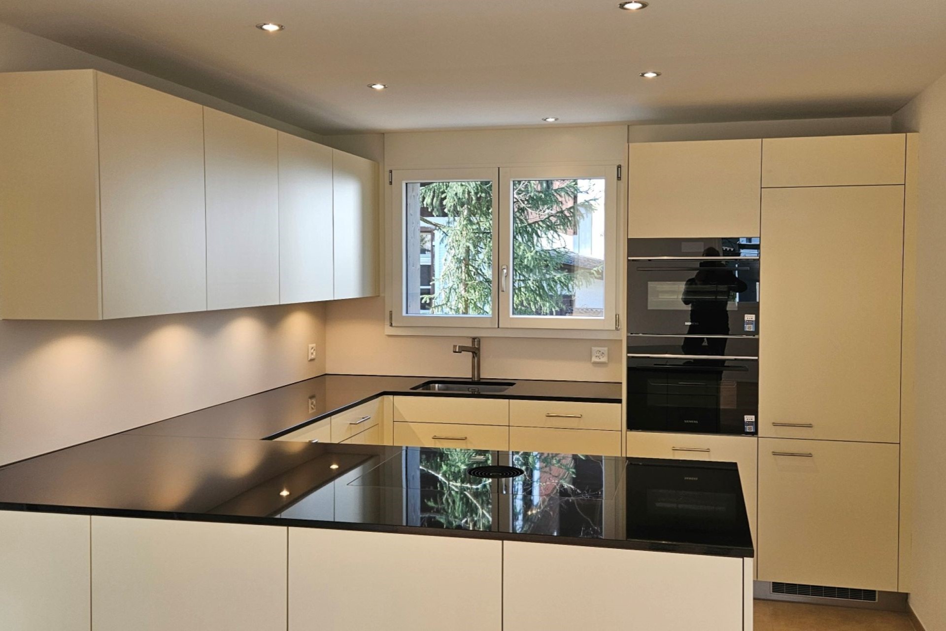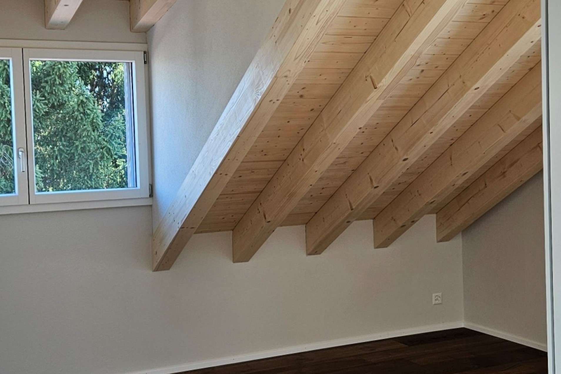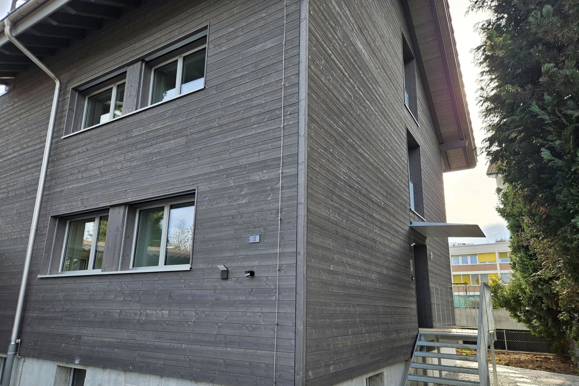 rückbau von bestehendem einfamilienhaus, ersatzneubau von zweifamilienhaus mit kleinwohnung im eg sowie familienwohnung im og-dg. das gebäude hat ein massives untergeschoss (hochparterre). ab eg ist das gebäude als holzelementbau konzipiert. die dachkonstruktion im dg ist sichtbar. dank einer abgeschrägten grundrissform konnte das grundstück maximal ausgenutzt werden. beheizt wird das gebäude mittels einer wärmepumpe und es verfügt zudem über eine pv-anlage.